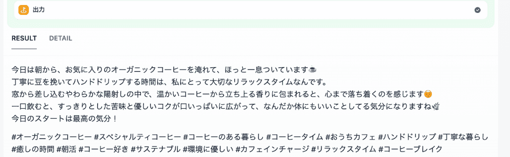 X向けには「あなたの毎日を劇的に変えます✨ 今なら30日間無料でお試しOK!」といった短文で親しみやすい文章が生成され、Instagram向けには「もし「もっと自分の時間を有効に使いたい」「ストレスフリーな毎日を送りたい」と感じているなら、〜」という文言とともに、関連するハッシュタグが10個以上自動で付与されました!