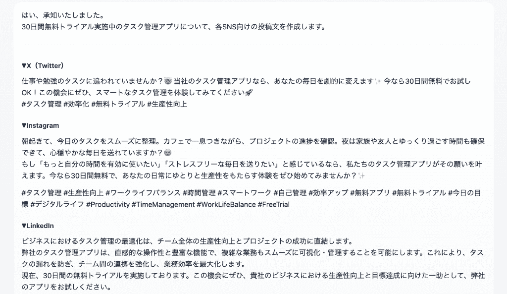 一方でLinkedIn向けには、「ビジネスにおけるタスク管理の最適化は、チーム全体の生産性向上とプロジェクトの成功に直結します。」といった、硬めの文章が出力されました。