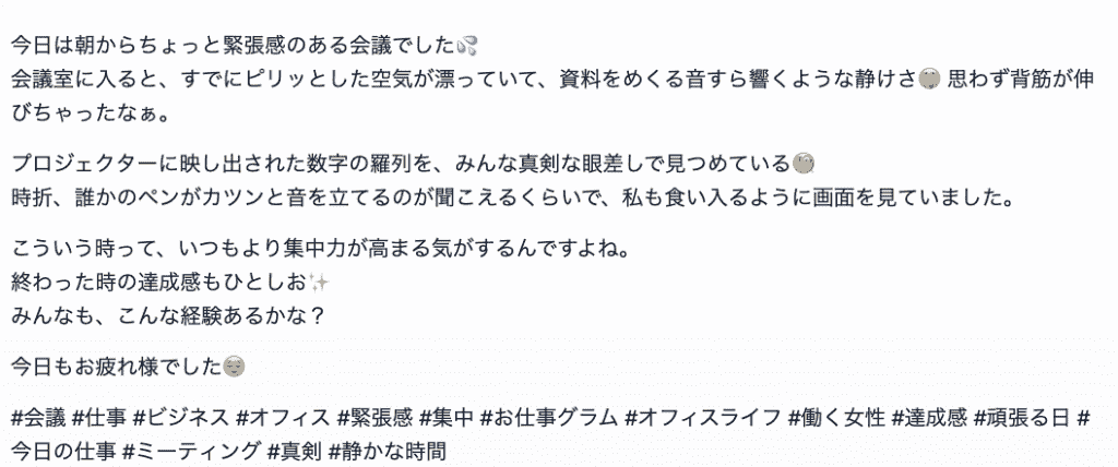 ↓「緊張感のある会議」のキーワードから生成されたコンテンツ