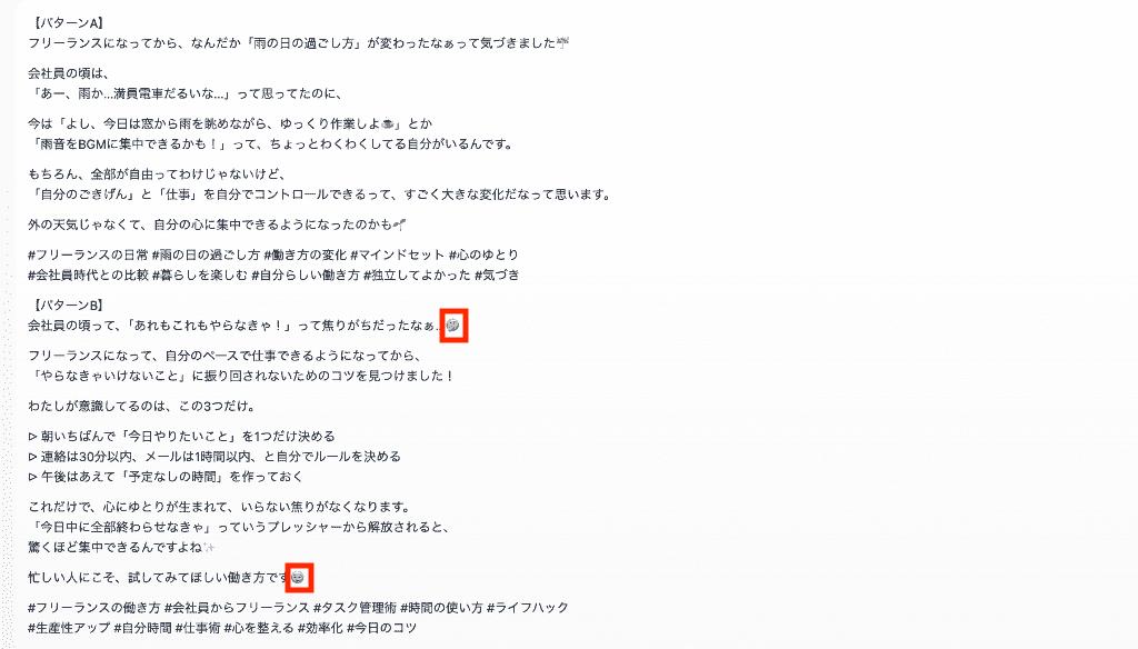 この点においては、「絵文字は5〜6個で」と指示を調整したところ、今度は絵文字が増えた文章が生成されました!(赤枠)