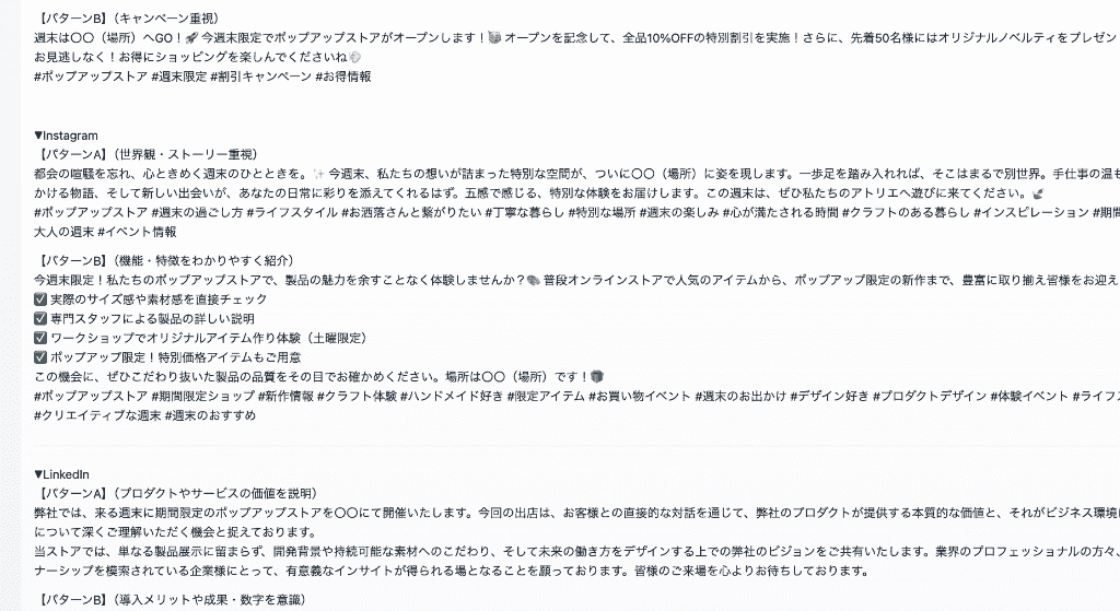 媒体ごとの特性をプロンプトでしっかり指示しているので、AIがそれに沿って投稿文を考えてくれた結果、修正の手間もほとんどありませんでした。