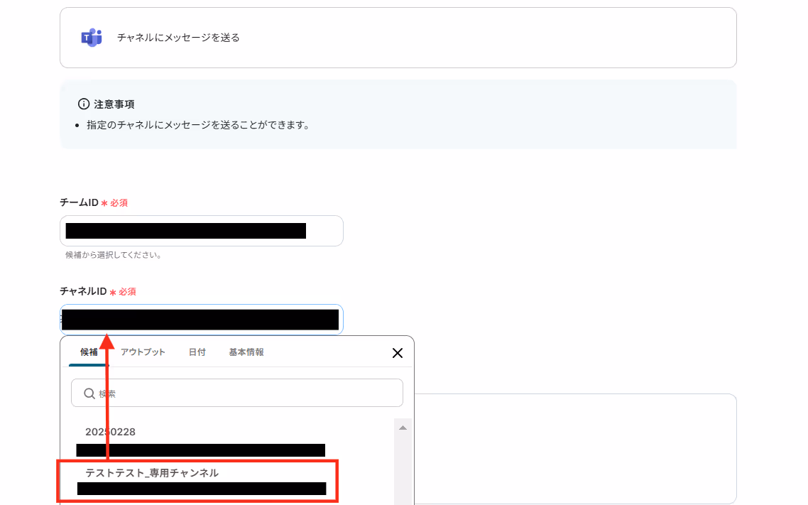 3.画面が切り替わったら、「チームID」「チャネルID」を候補から選択します。