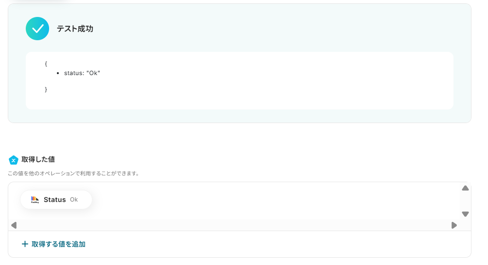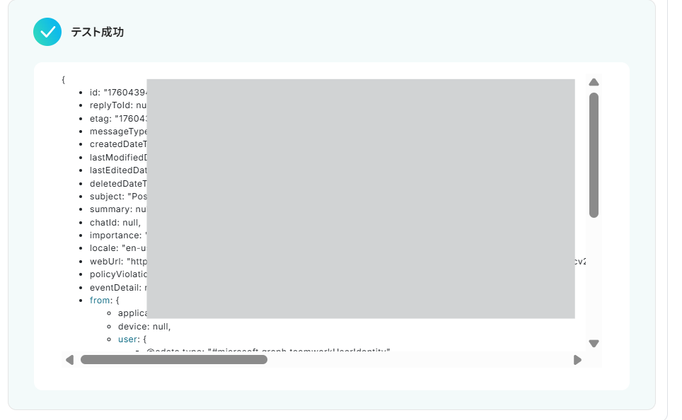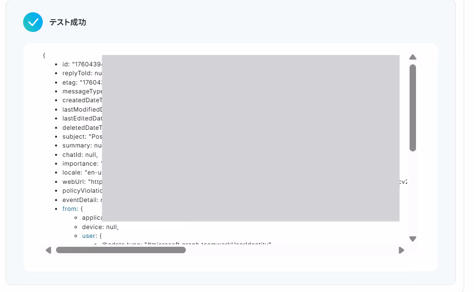 テストが成功するとテスト成功画面と取得した値が表示され、Microsoft Teamsのデータが確認できます。保存するをクリックして次へ進みましょう。