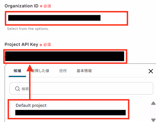 3.「Organization ID」と「Project API Key」は入力欄をクリックし、候補から入力しましょう