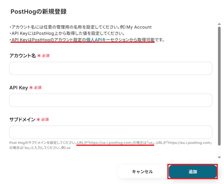 ・「サブドメイン」も同様に、PostHogにログインしてURLから抽出し、入力後に「追加」を押します。