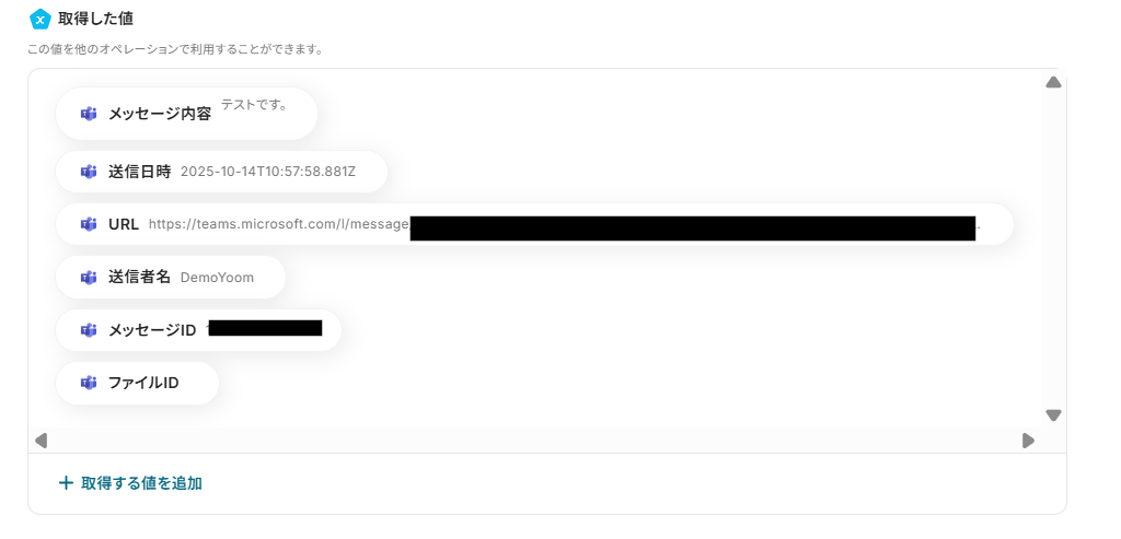 取得した値を使用することで、Microsoft Teamsに投稿されたメッセージに基づきその都度異なる内容が反映されます。