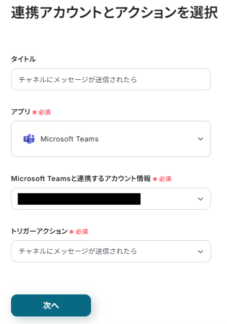 タイトルと連携するアカウント情報を任意で設定し、トリガーアクションはテンプレート通りに「チャネルにメッセージが送信されたら」のまま「次へ」をクリックして進んでください。