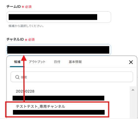 4.「チームID」「チャネルID」は入力欄をクリックし、候補から選択します。