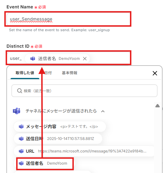 ・「Distinct ID」は任意の内容と、先ほどの取得した値 を組み合わせて入力しました。 取得した値を使用することで、Microsoft Teamsに投稿されたメッセージに基づきその都度異なる内容が反映されます。