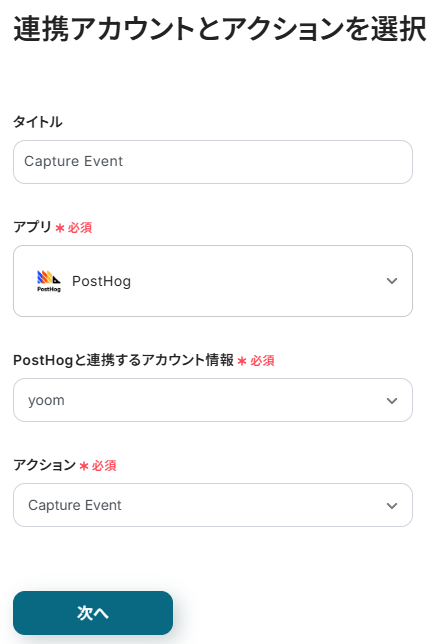 先ほどと同様にタイトルと連携するアカウント情報を任意で設定し、アクションはテンプレート通りに「Capture Event」のまま「次へ」をクリックして進んでください。