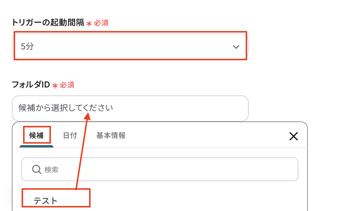 次に、フォルダIDはボタンをクリックすることで表示されます。連携済みのアカウントに基づいて表示されているので、使用するフォルダを候補から選択してください。