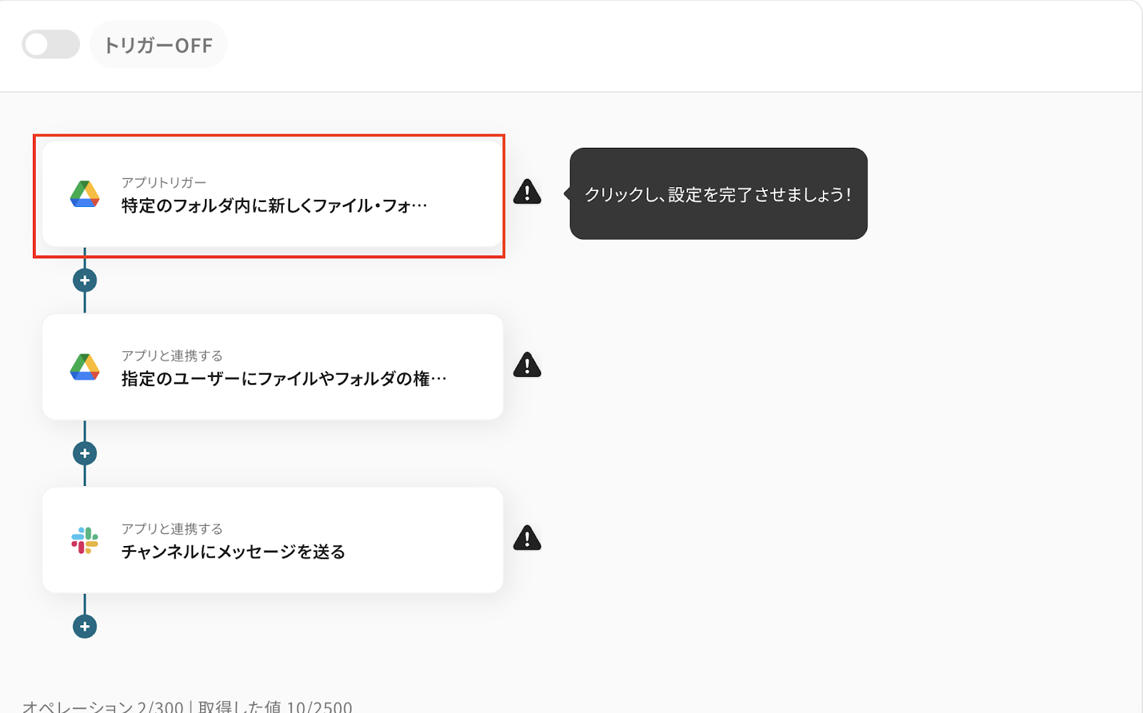 ステップ3:Google Driveのトリガーを設定しよう(特定のフォルダ内に新しくファイル・フォルダが作成されたら)