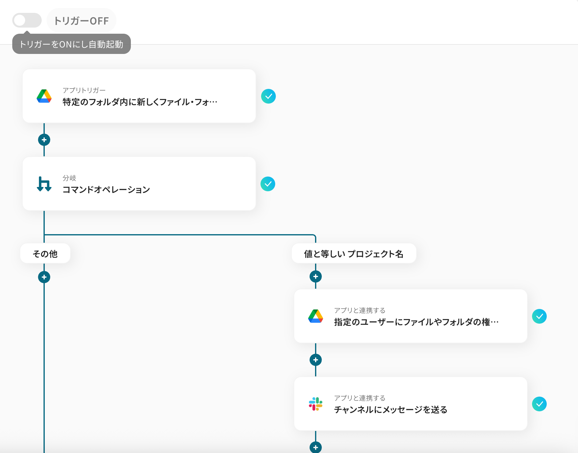 Google Drive上でのファイル作成や更新をトリガーに、SlackやChatworkなどのチャットツールへ自動で通知する ことで、関係者への情報共有を迅速かつ漏れるリスクを軽減できるため、確認作業の手間を省くことができます。