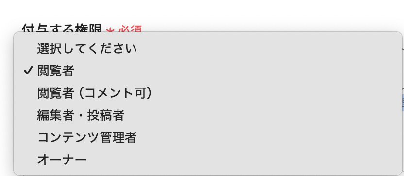 付与する権限は注釈にも記載がありますが、「現状の権限より強い権限のみ付与が可能」です。 こちらをふまえて、プルダウンから選択してください。
