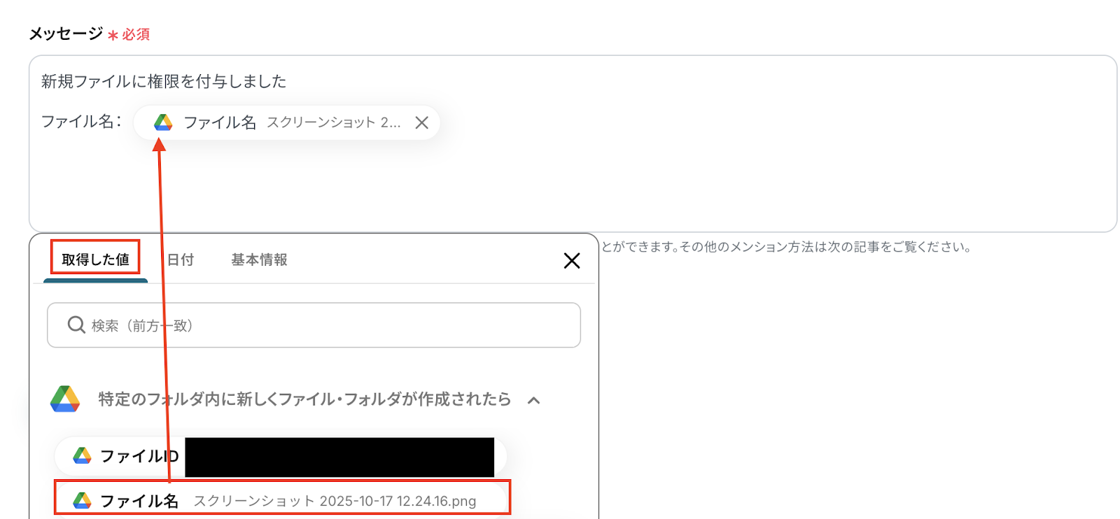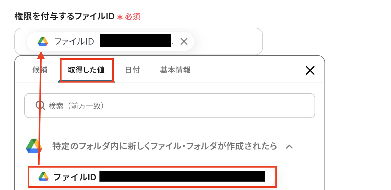 権限を付与するファイルIDは下記の画像のように、Google Driveのトリガーで取得した値から選択 しましょう。