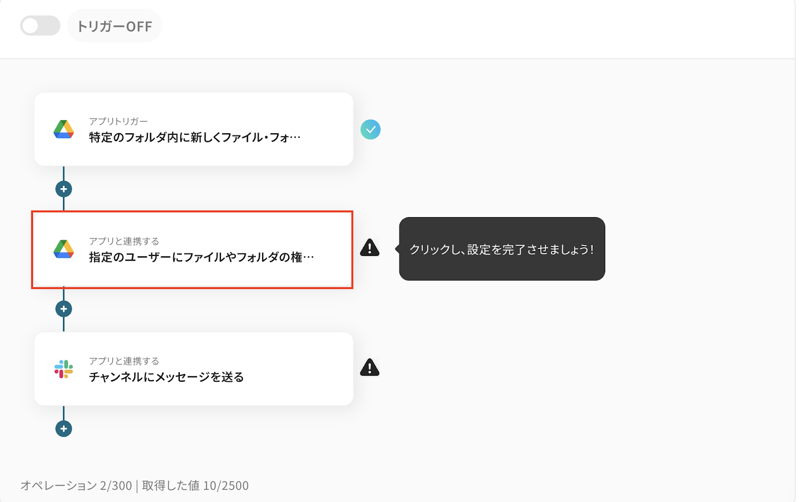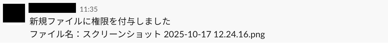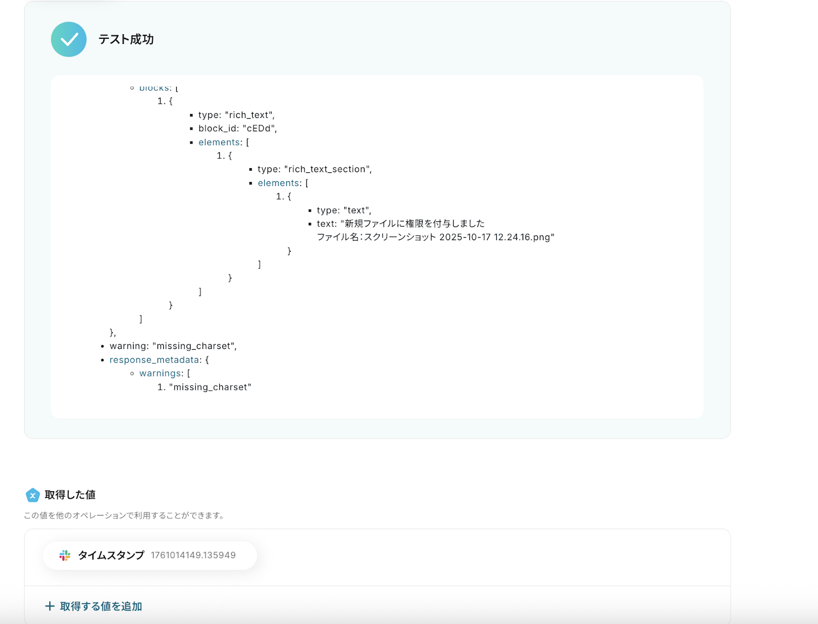 メッセージには通知したい内容を設定します。 Google Driveのトリガーで取得した値の「ファイル名」などを選択しておけば、Slack上でどのようなファイルに権限が付与されたか確認しやすい ですね。 なお、取得した値を活用せずテキストを直接入力した箇所は固定値のため定型文となります。