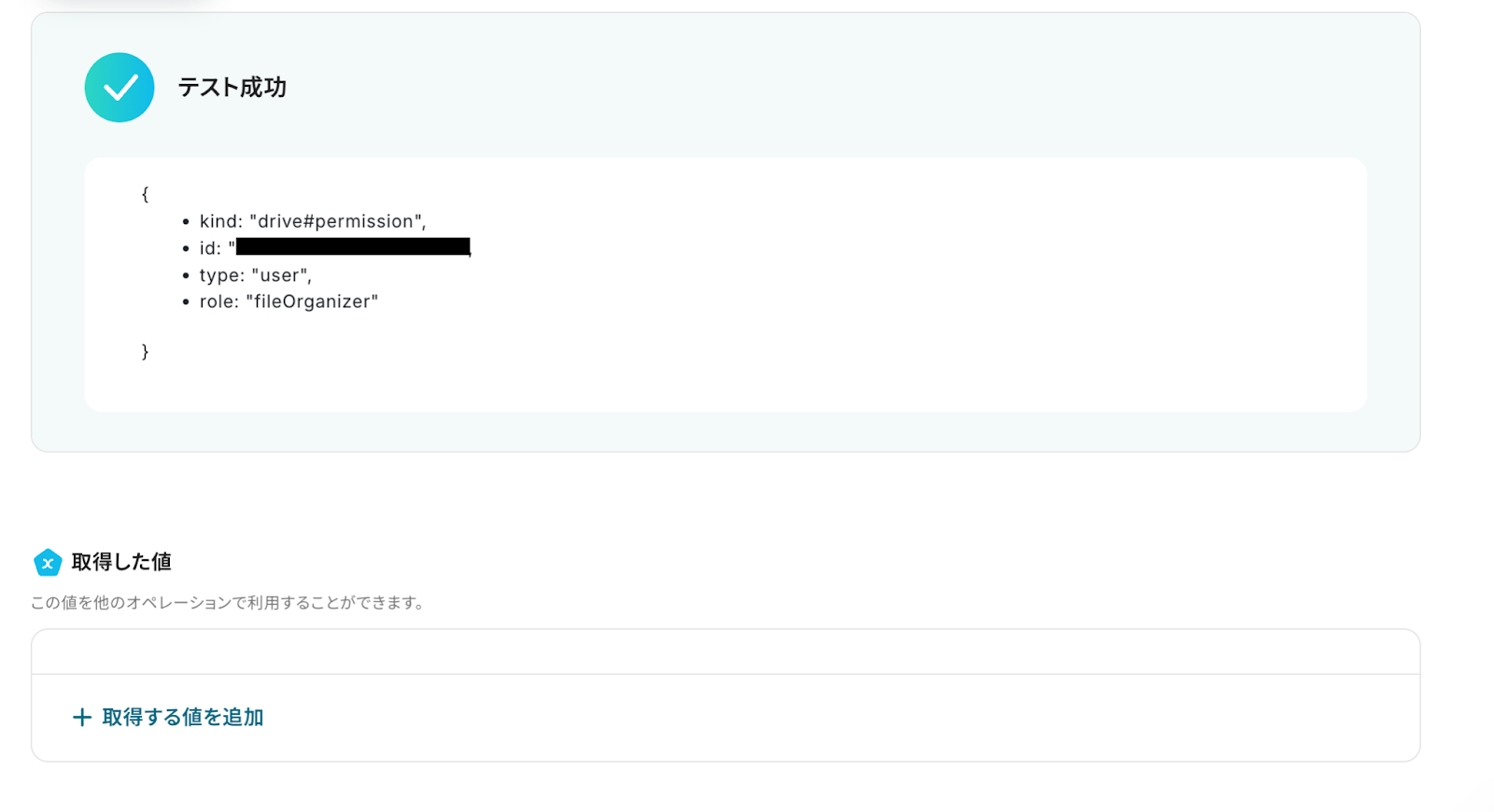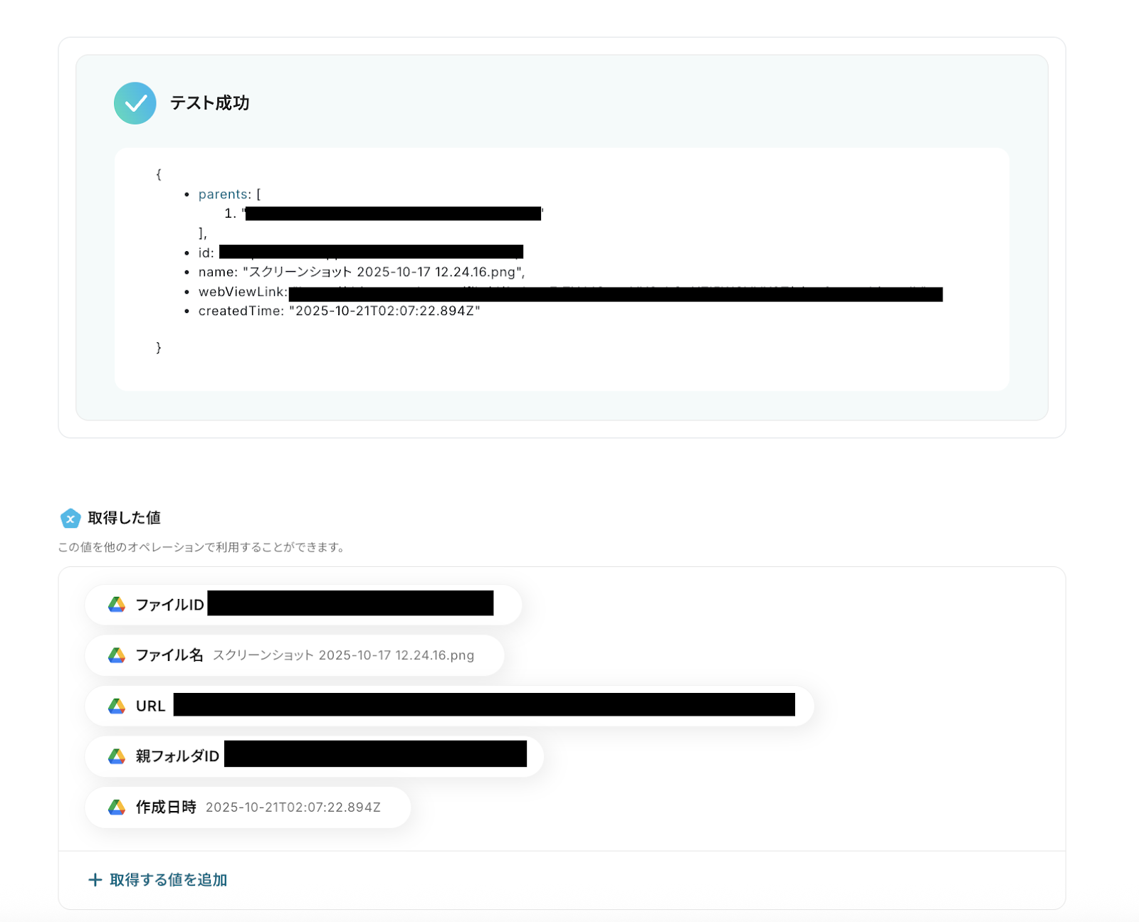 テストが成功するとテスト成功画面と取得した値が表示され、Google Driveのデータが確認できます。 「保存する」をクリックして完了です!取得した値について、詳しくは以下をご参照ください。なお、この取得した値をこの後の設定で活用していきます。
