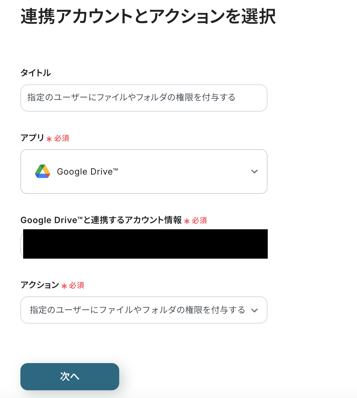 ステップ4:Google Driveのアクションを設定しよう(指定のユーザーにファイルやフォルダの権限を付与する)