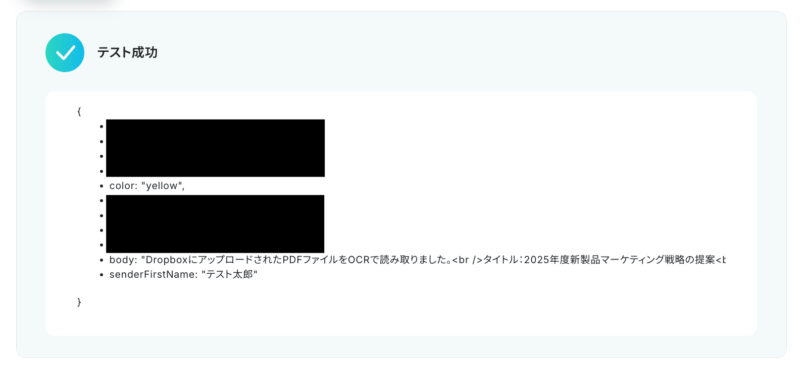 テスト成功時には、HiveにOCRで抽出した内容が送信されます。
