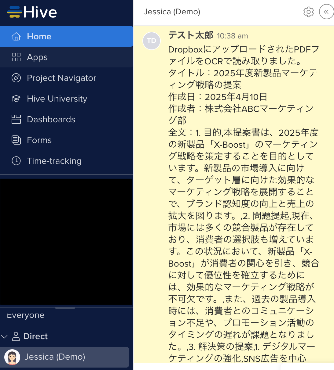 それではここから代表的な例として、DropboxにPDFファイルが作成された際に、OCR機能でテキストを自動で読み取り、プロジェクト管理ツールであるHiveにメッセージを作成するフローを解説していきます!