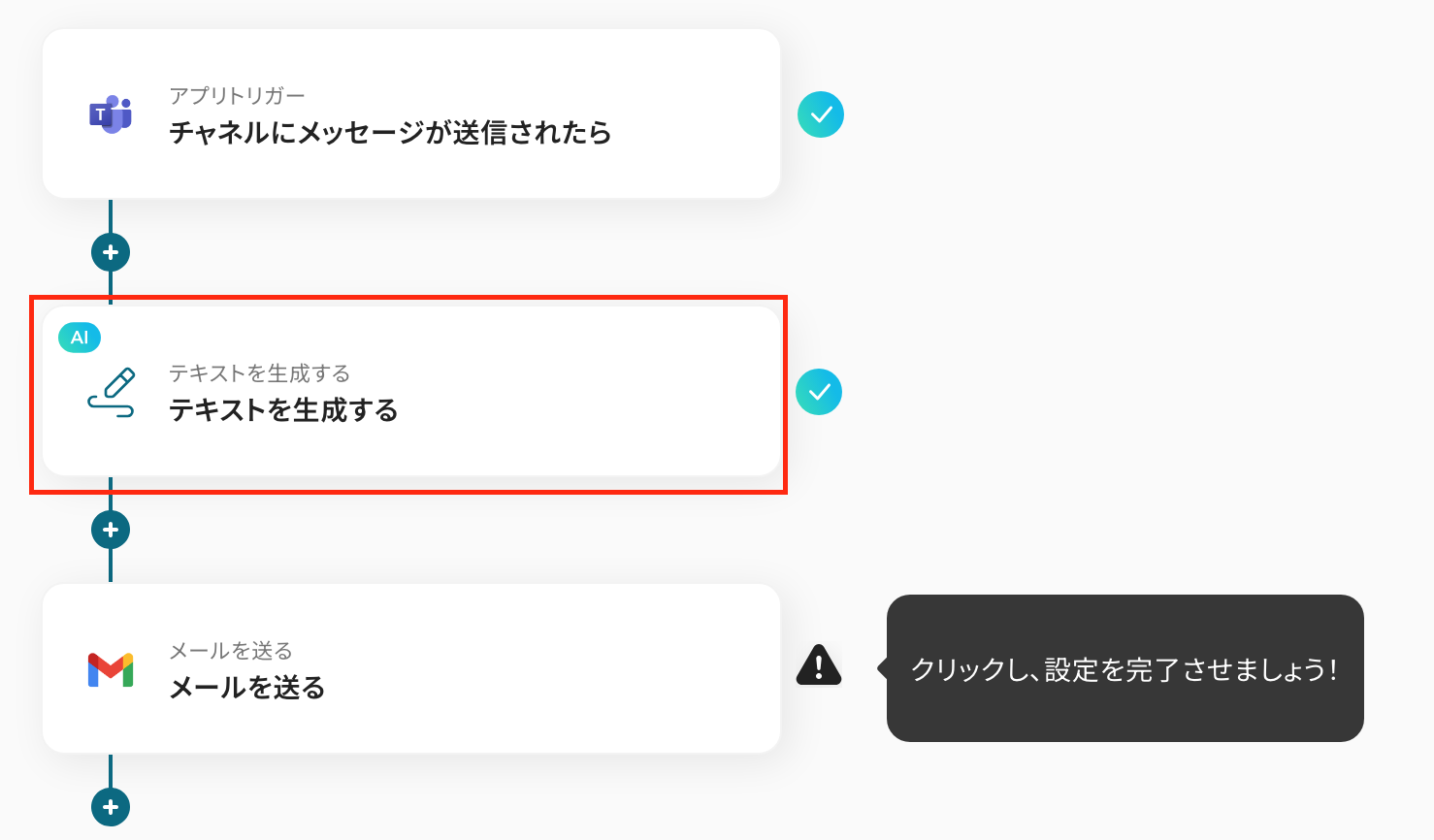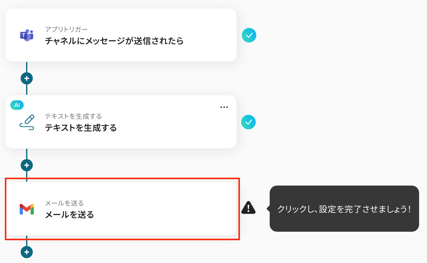 最後の設定です! ここでは、生成したテキストをGmailに通知する設定をします。 以下の赤枠をクリックしてください。
