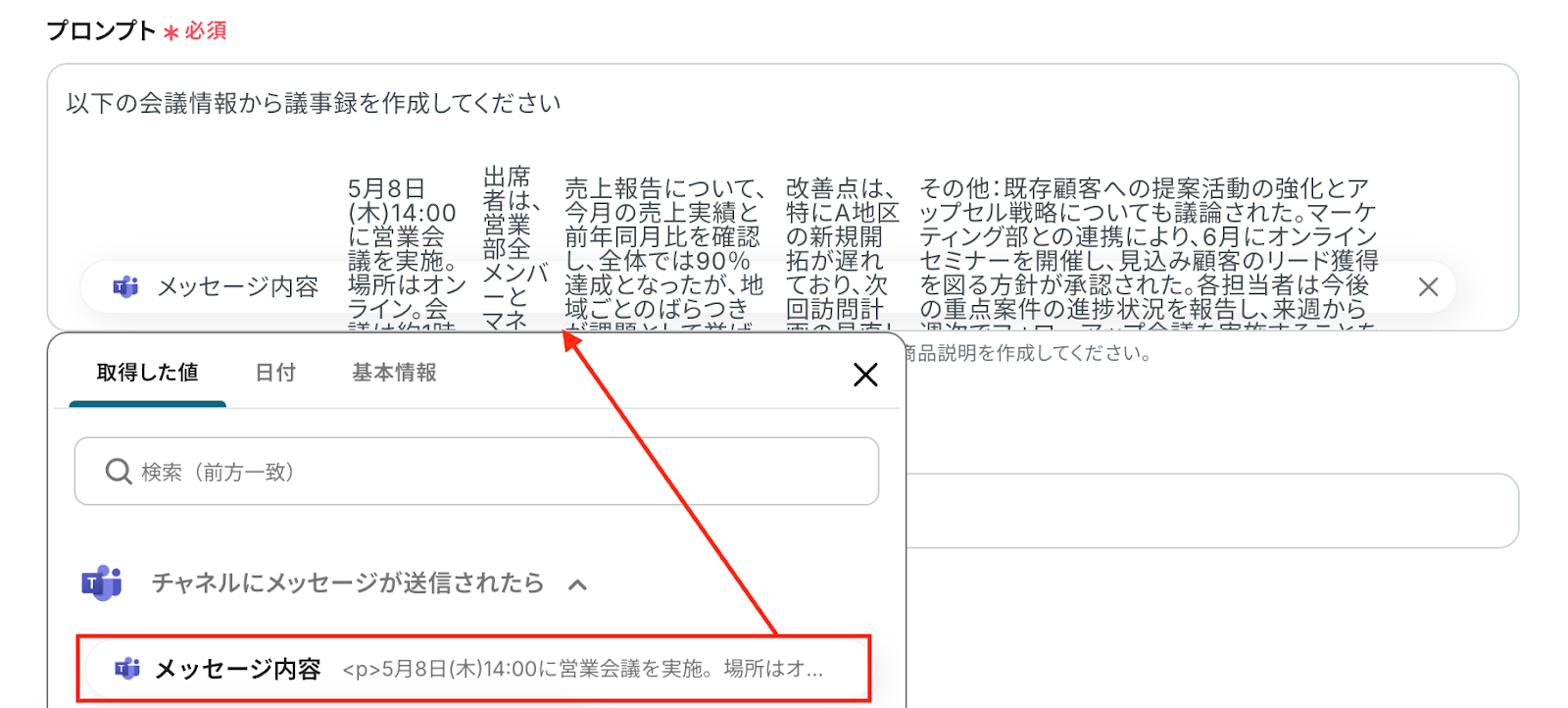 続いて詳細設定の画面に移り、AIでテキストを生成する際に使用する「プロンプト」を設定します。 ここでは、Microsoft Teamsに投稿された情報を活用しましょう。ボックスをクリックすると、先ほど取得した値が表示されるので引用します。