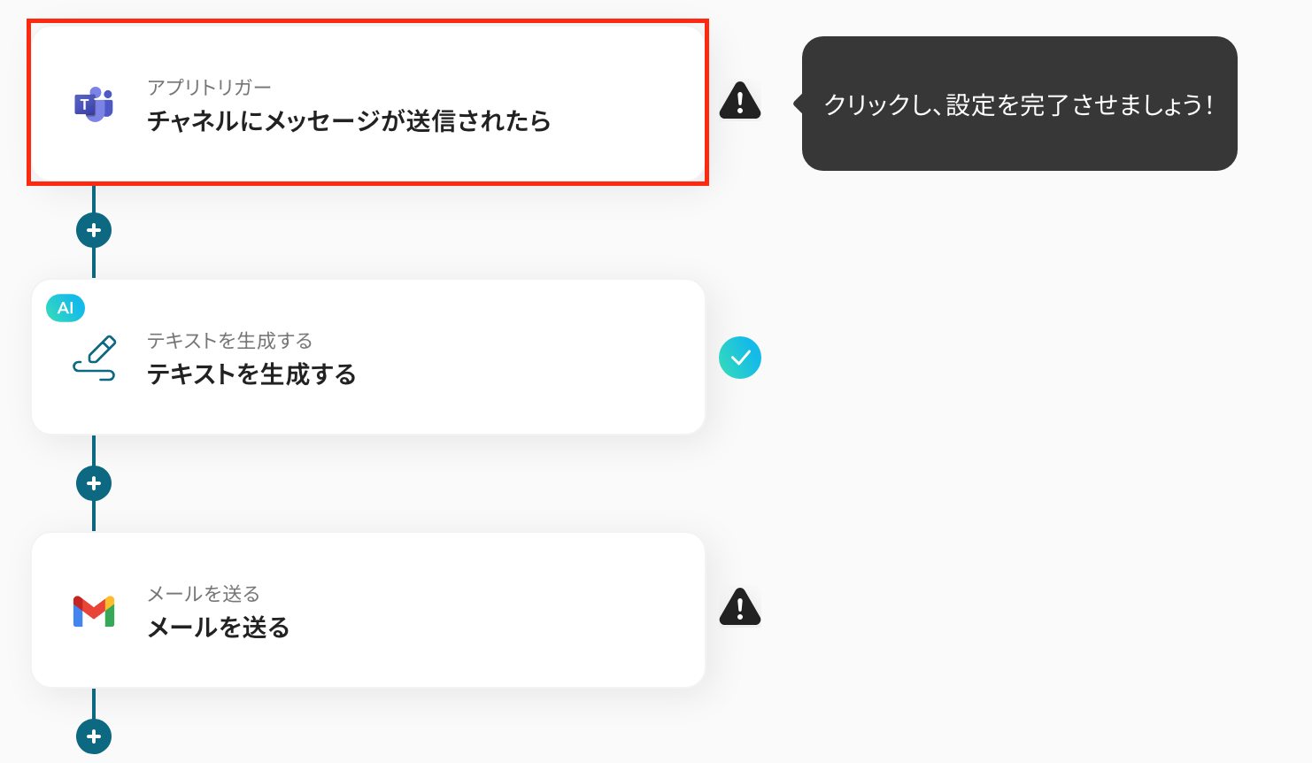 ここでは、Microsoft Teamsに投稿した文章からテキストを生成する 設定をします。 以下の赤枠をクリックしましょう。