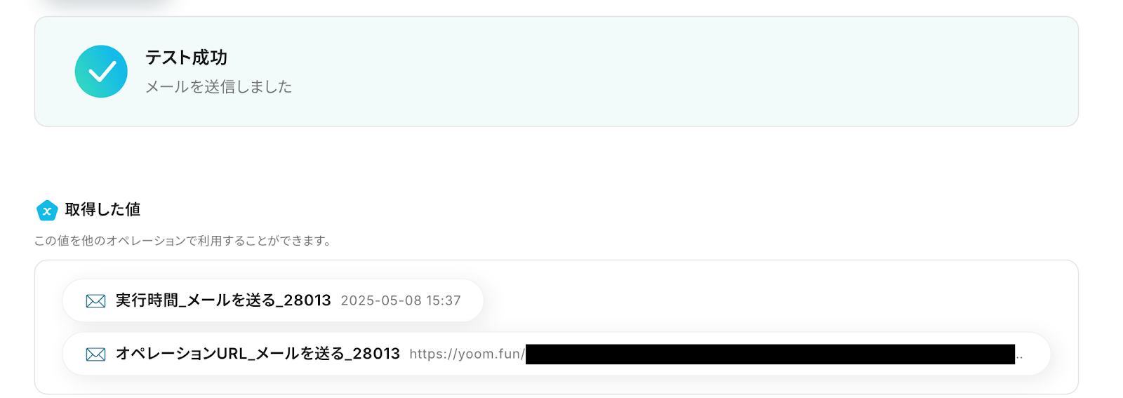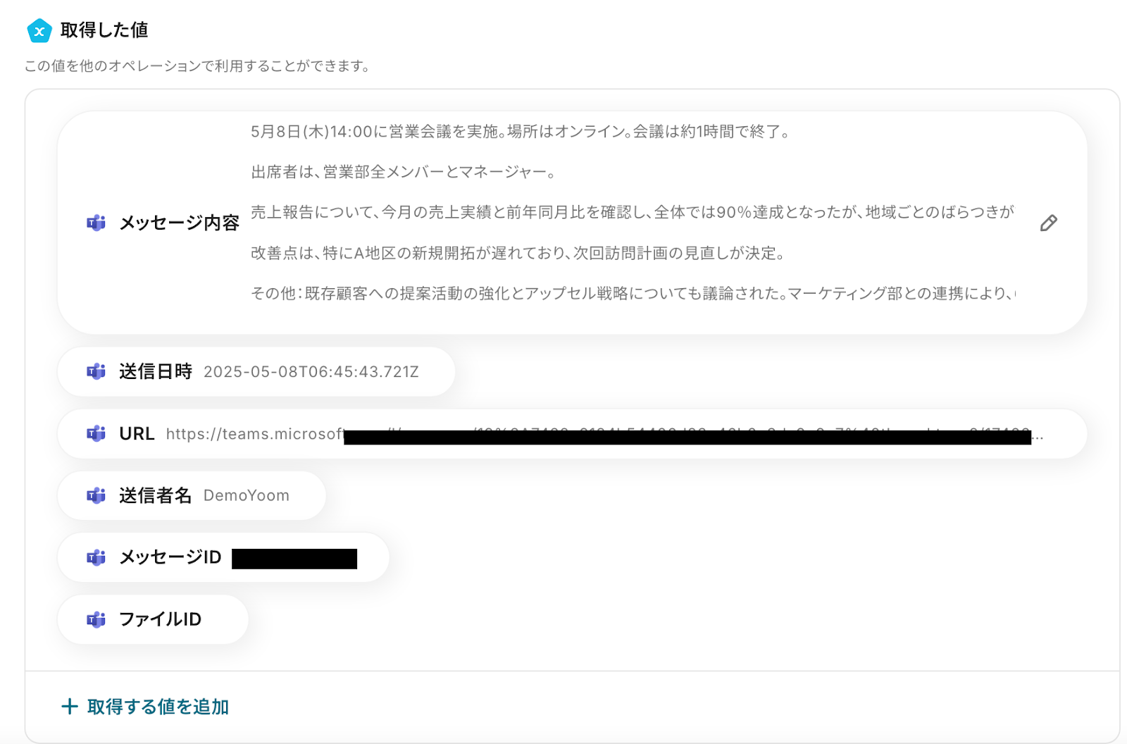 テストをクリックします。 テストに成功したら、以下の画像のようなアウトプット(取得した値)が表示されます。 このアウトプット(取得した値)は、次のステップで活用します。 ※取得した値 とは? トリガーやオペレーション設定時に、「テスト」を実行して取得した値のことを指します。 後続のオペレーション設定時の値として利用でき、フローボットを起動する度に変動した値となります。