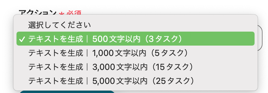 アクション選択の画面に遷移したら、タイトルを任意で修正します。 ※テキストを生成する機能のアクションは以下のように「指示可能なプロンプトの文字数」によって消費するタスク数が異なるのでご注意ください。