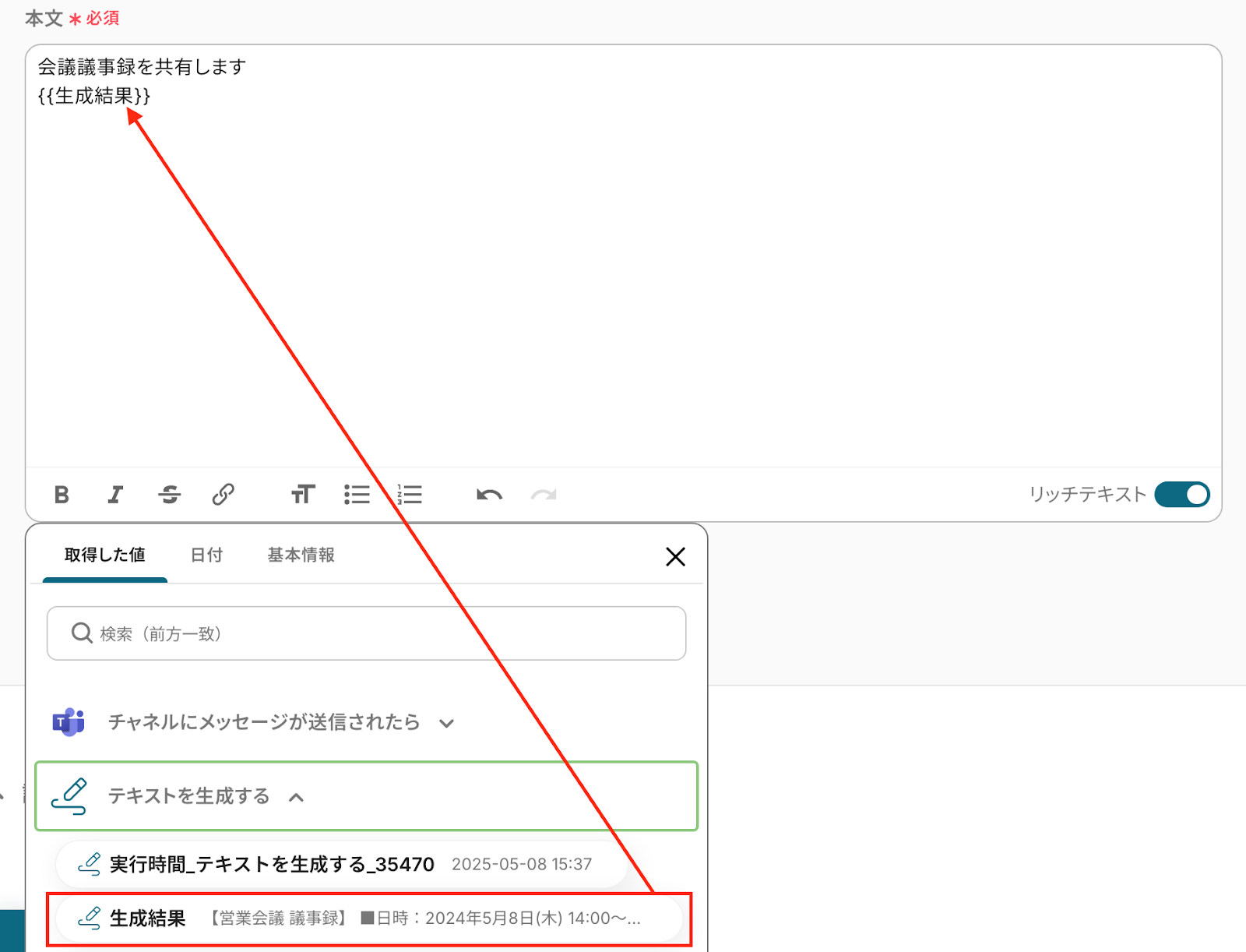 「本文」の設定では、入力欄をクリックして表示されるアウトプット(取得した値)と任意の文章を組み合わせて設定しましょう。 取得した値を利用することで、トリガーが起動するたびに最新の値を自動で引用できます。