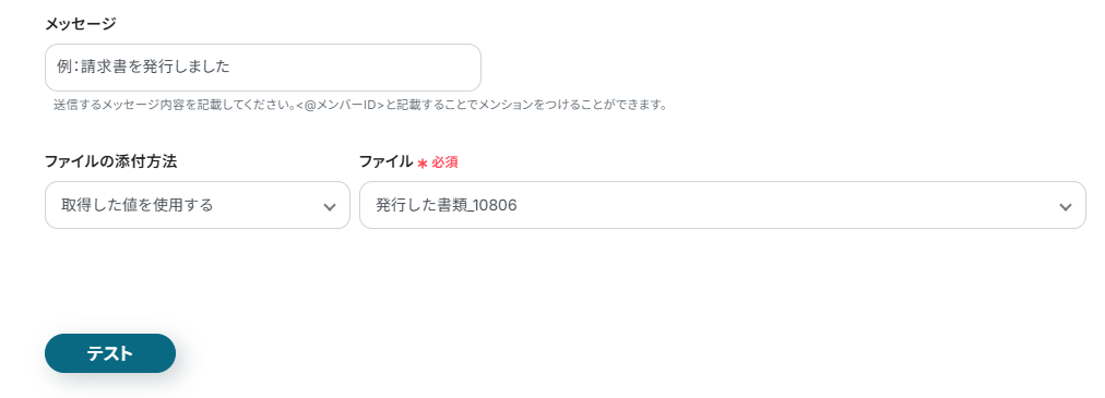 4.任意の「メッセージ」を入力し、そのままテストを行いましょう! (<@メンバーID>と記載することでメンションをつけることができます)