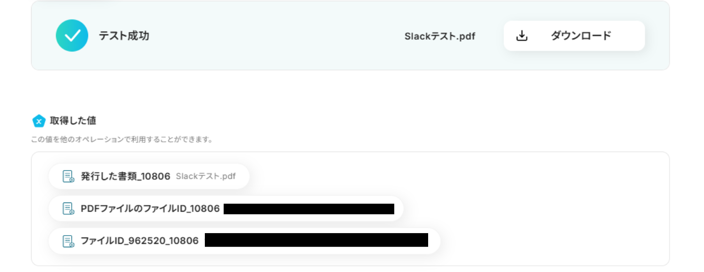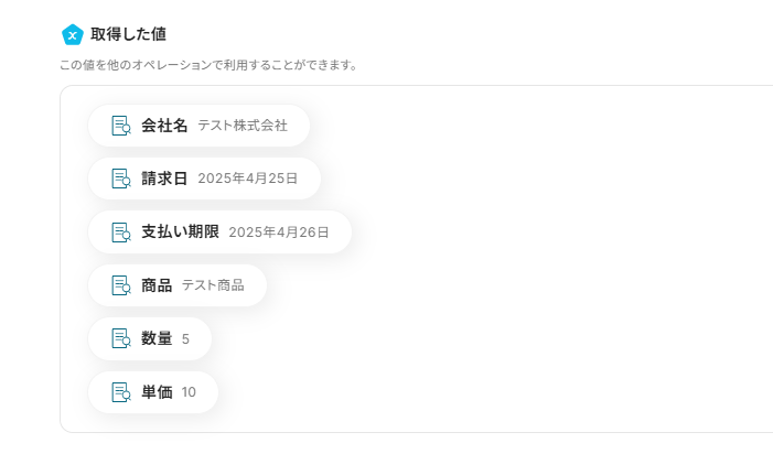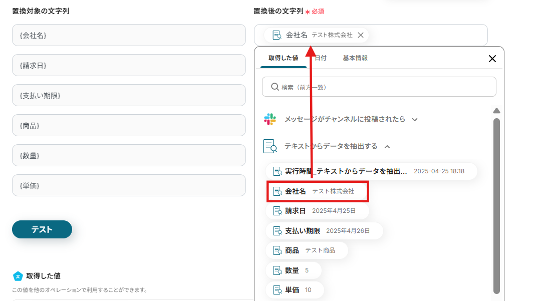 6.設定後、「テスト」をクリックしてください。テストが成功した場合は、アウトプット(取得した値) が取得できます。 こちらの値は次の設定時に活用するので、取得された内容を確認しましょう。