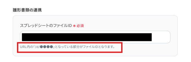 以下の赤枠を参考に「スプレッドシートのファイルID」を入力しましょう。