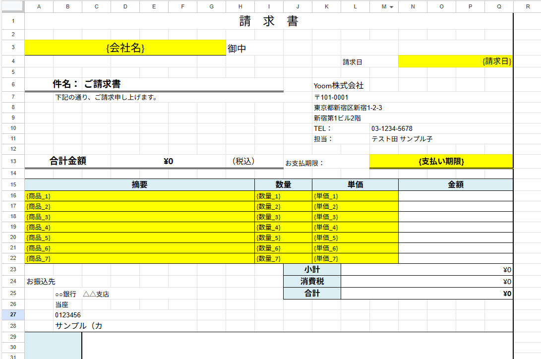 請求書を発行するにあたって、雛形となる書類の準備が必要です。 Google スプレッドシートで請求書の雛形を作成してください。Slackの投稿内容をもとに{}で囲んだ項目が置換されます。 雛形書類の作成方法は、こちらのヘルプページ で確認できます。 下図の雛形の場合、{会社名}・{請求日}・{支払い期限}・{商品_1}などが置換対象です。