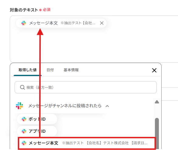 3.次に「対象のテキスト」を設定します。 Slackの投稿から取得するため、Slackのアウトプット(取得した値)から「メッセージ本文」を選択してください。