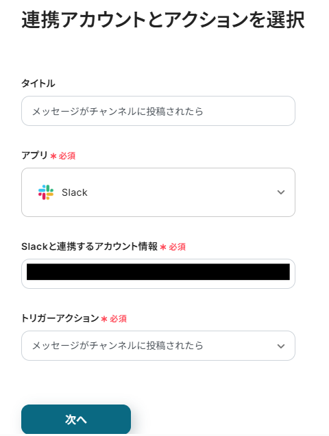 タイトルと連携するアカウント情報を任意で設定し、トリガーアクションはテンプレート通りに「メッセージがチャンネルに投稿されたら」のまま「次へ」をクリックして進んでください。