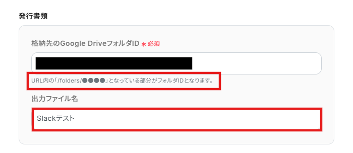 「格納先のGoogle DriveフォルダID」も赤枠部分を参考に入力しましょう。 「出力ファイル名」は任意の名前でOKです!