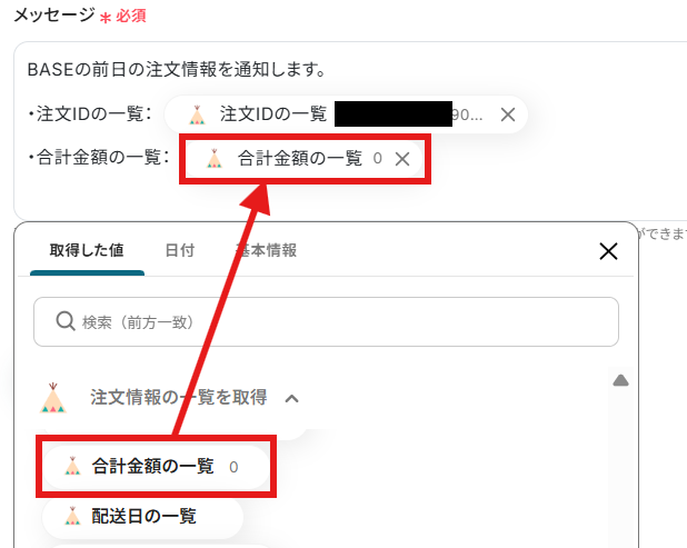 - 次に、オペレーションでBASEの「注文情報の一覧を取得」アクションを設定し、取得したい注文情報の期間などを指定します。