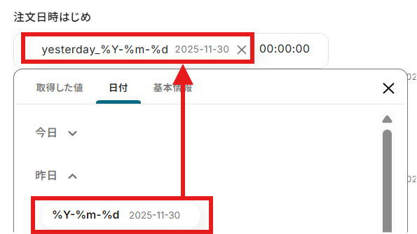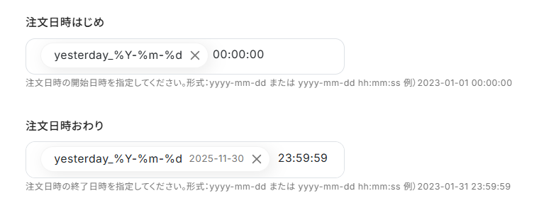 取得する期間を設定します。今回は前日の0時から23時59分59秒までの注文を拾う設定にしています。