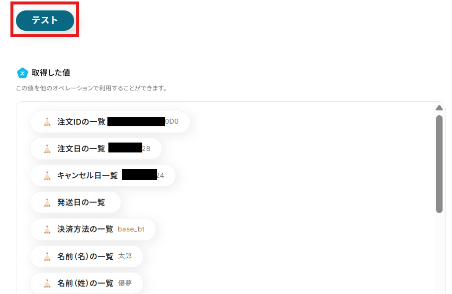 取得した値とは、トリガーやオペレーション設定時に、「テスト」を実行して取得した値のことを指します。