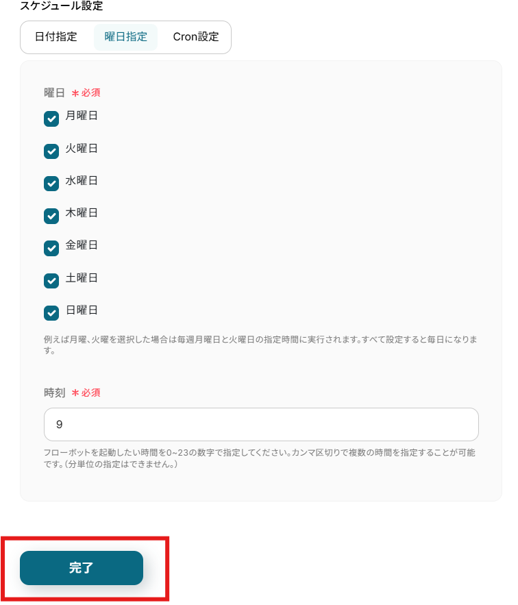 今回は以下のように、毎日午前9時に起動するように設定しました。設定が済んだら「完了」ボタンを押してください。