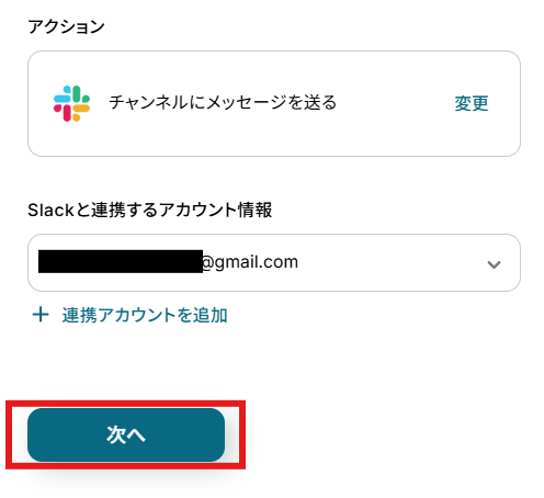連携アカウントとアクションを確認していきます。アクションはデフォルト設定のまま、アカウント情報は、連携したいアカウントが選択されているか確認してください。