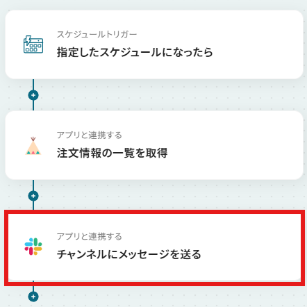 - 最後に、オペレーションでSlackの「チャンネルにメッセージを送る」アクションを設定し、取得した注文情報を任意のチャンネルに通知します。