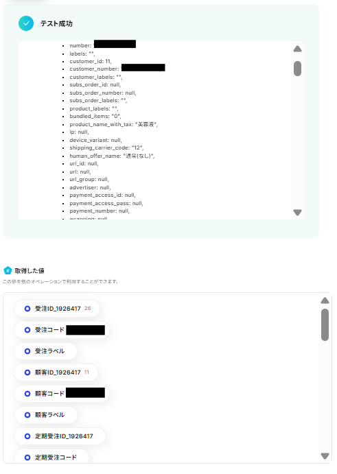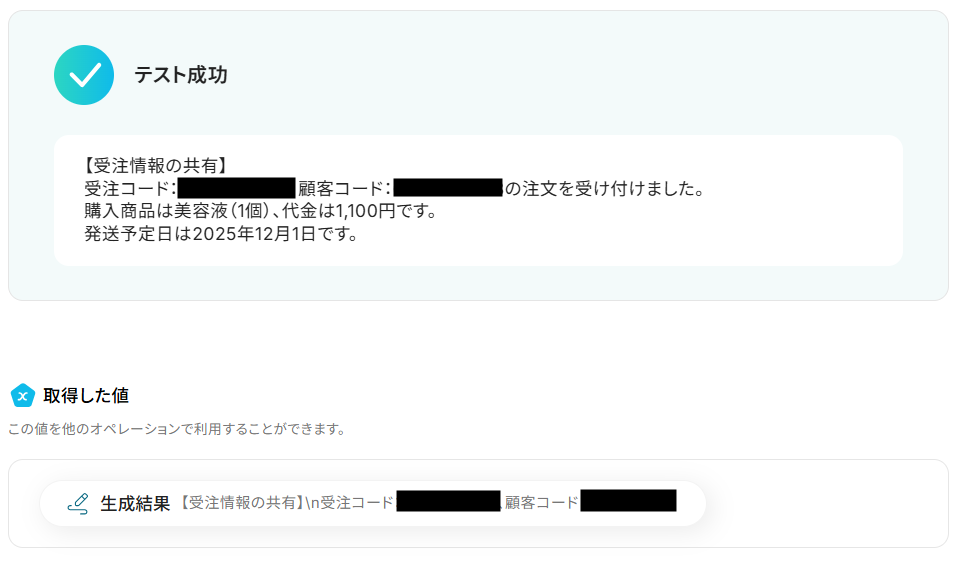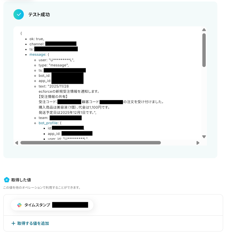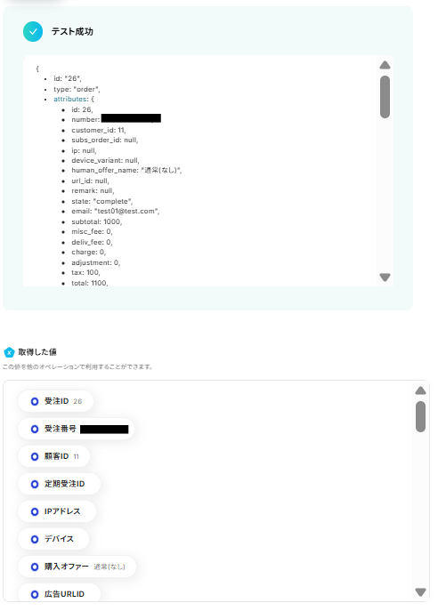 テストが成功すると、取得した値の各項目の横にecforceに登録した受注の基本情報が表示されます。