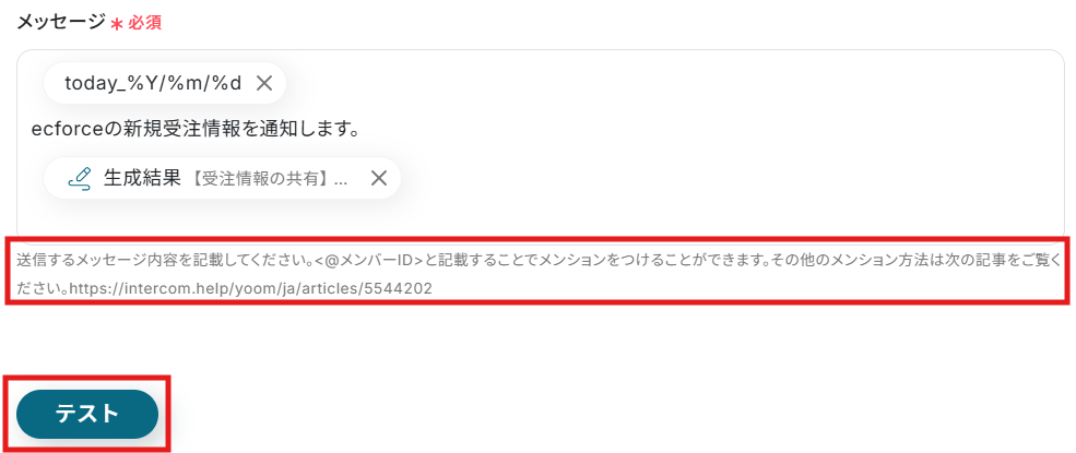 - 最後に、オペレーションでSlackの「チャンネルにメッセージを送る」アクションを設定し、ecforceから取得した情報を通知するよう設定します。