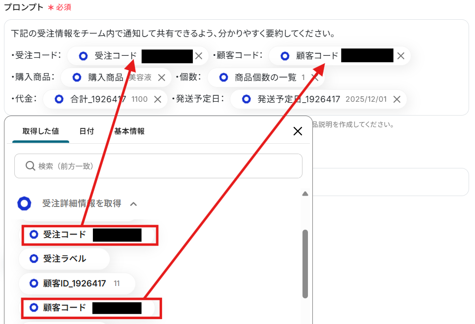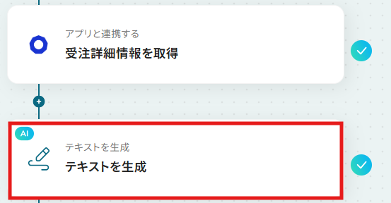 - 次に、オペレーションでAI機能の「テキストを生成」アクションを設定し、取得した受注詳細を指定のプロンプトで要約します。