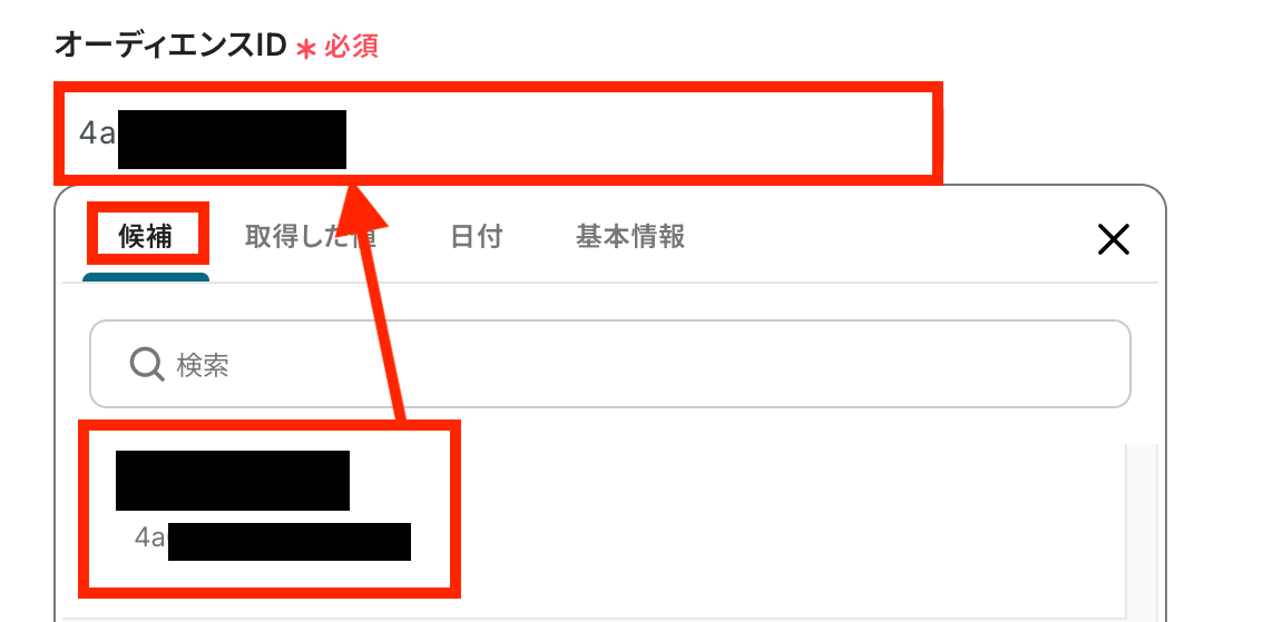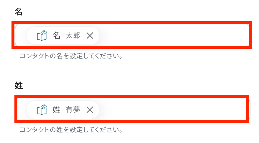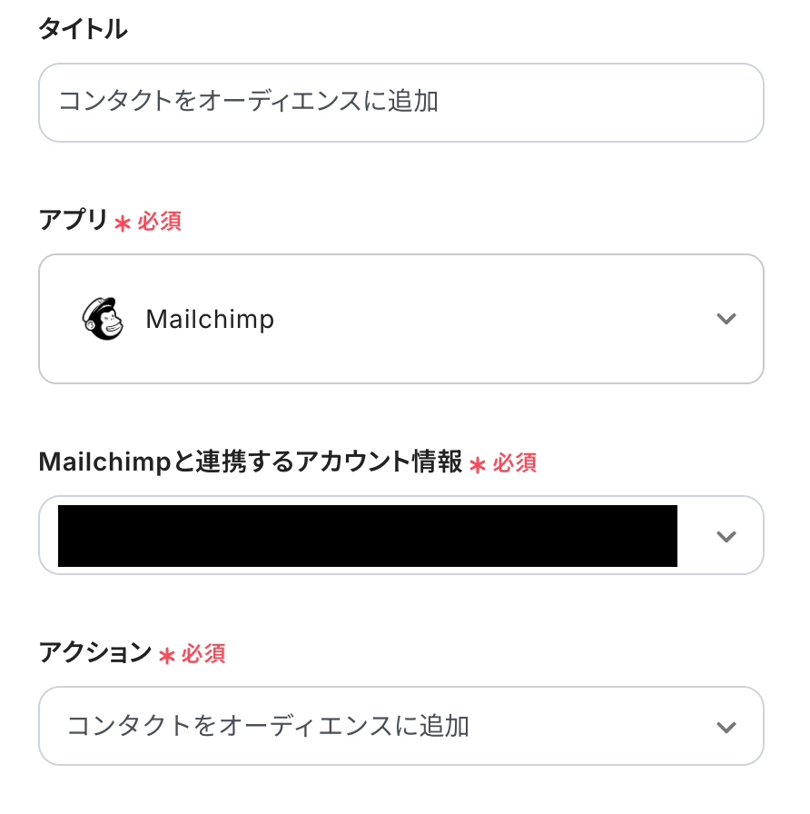 この際も先ほど抽出した際に取得した値を活用しましょう。なお、手入力でテキストを入力することも可能ですが、テキストを手入力した場合は固定値となり、毎回同じデータがMailchimpに登録され続けるため注意が必要です。