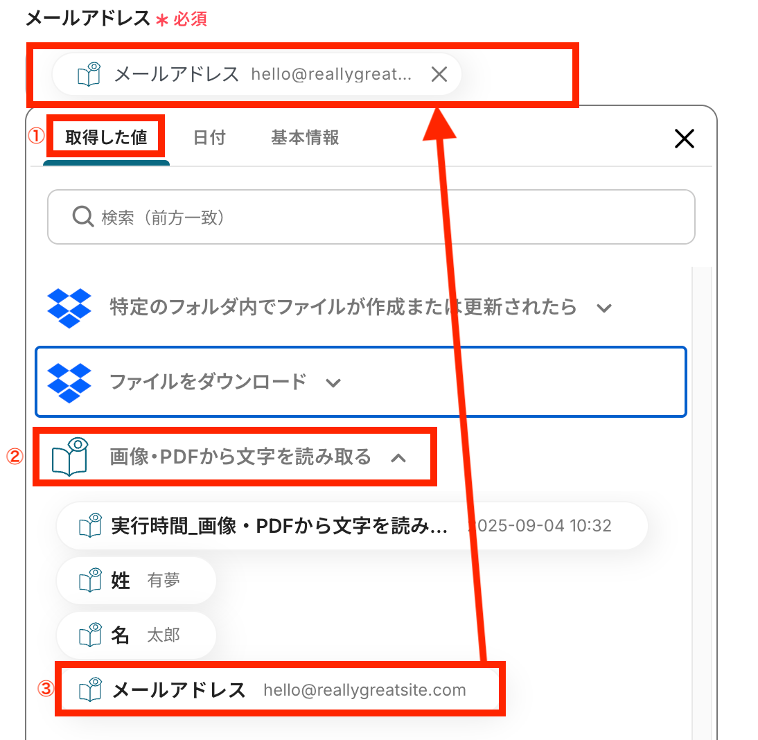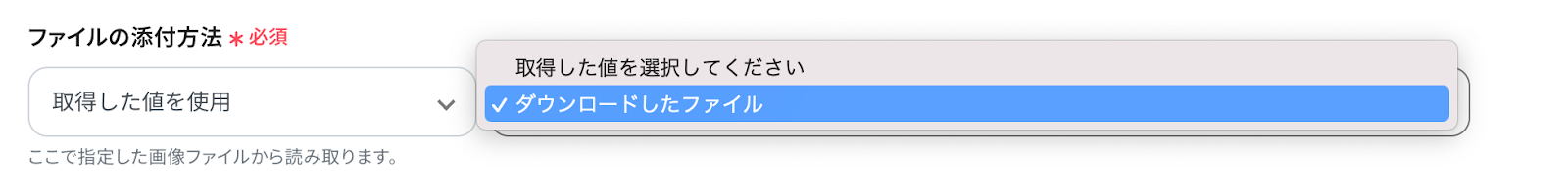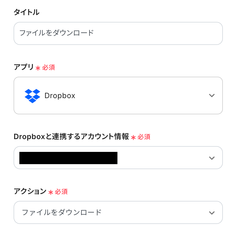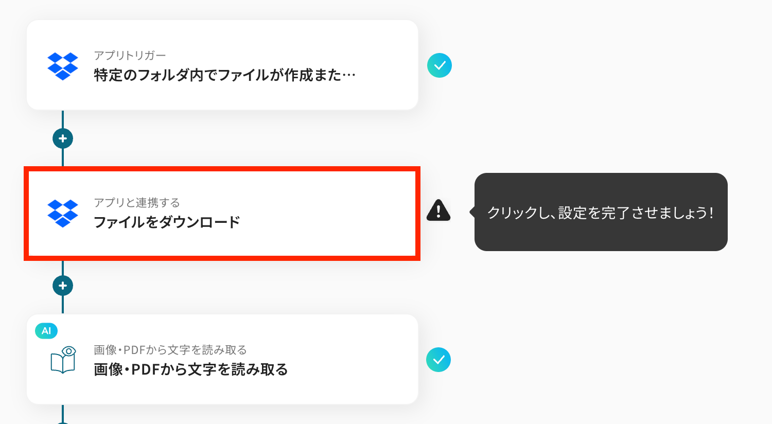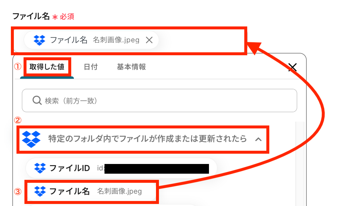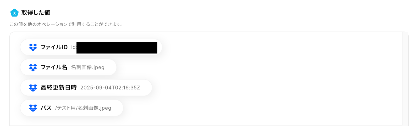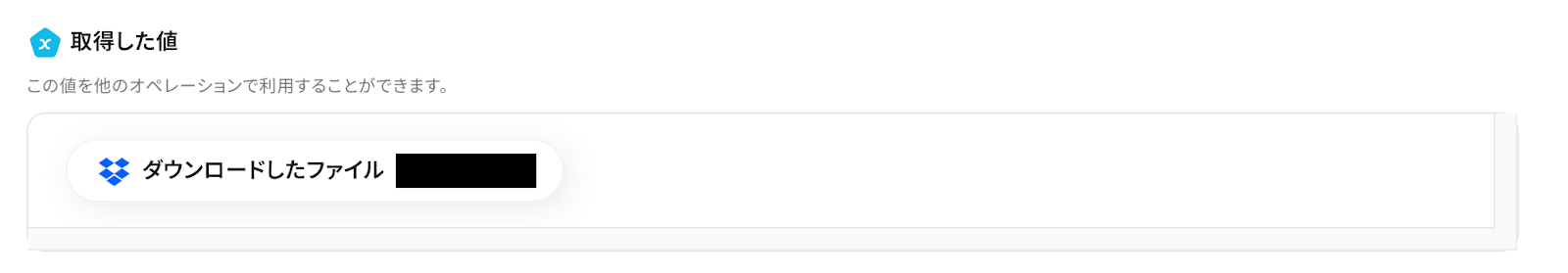 テストに成功すると「取得した値」としてDropboxに保存したファイルデータがアウトプットされます。この取得した値を用いてこの後のフローを設定していきます。