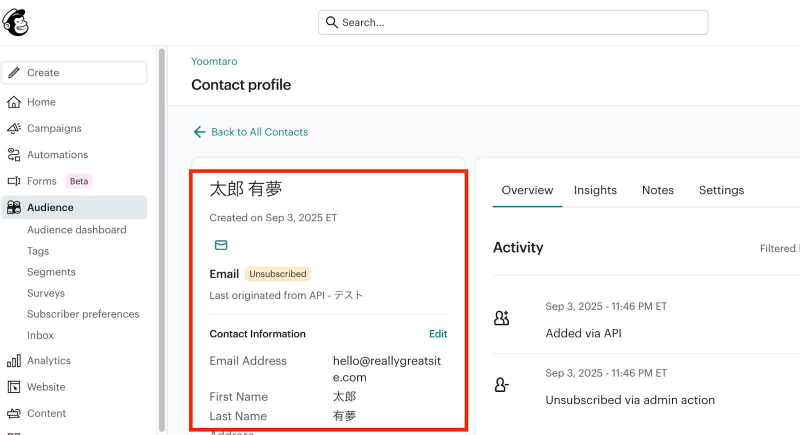 Mailchimpの画面でもコンタクトが追加されていることを確認しましょう。