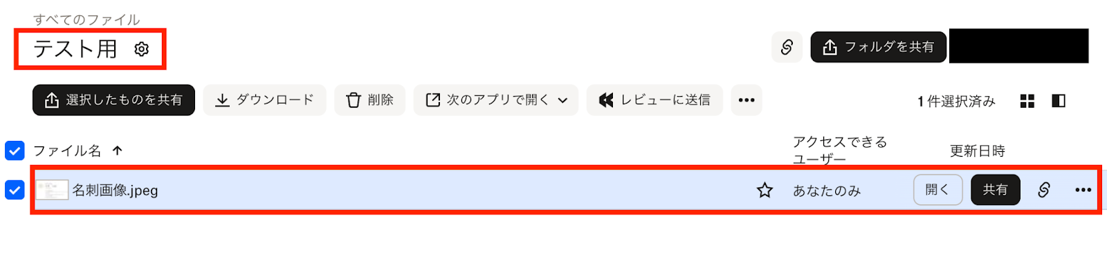 Dropbox内に「テスト用」のファイルを作成して、その中に保存しました。